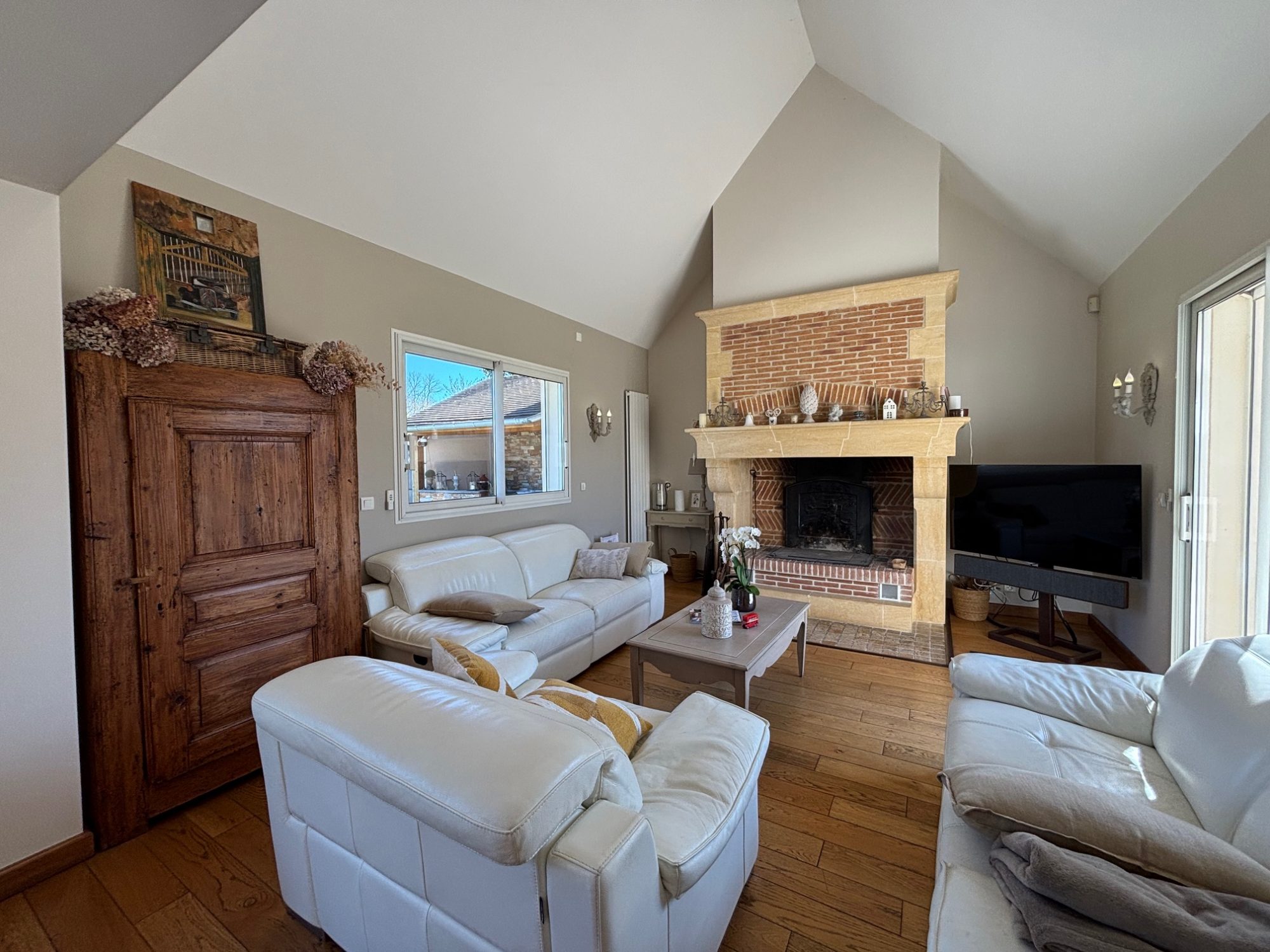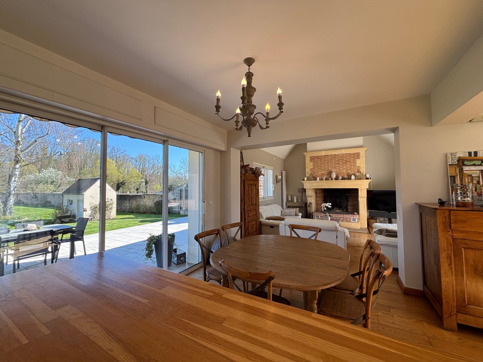 Pièce de vie avec salon salle à manger avec cheminée